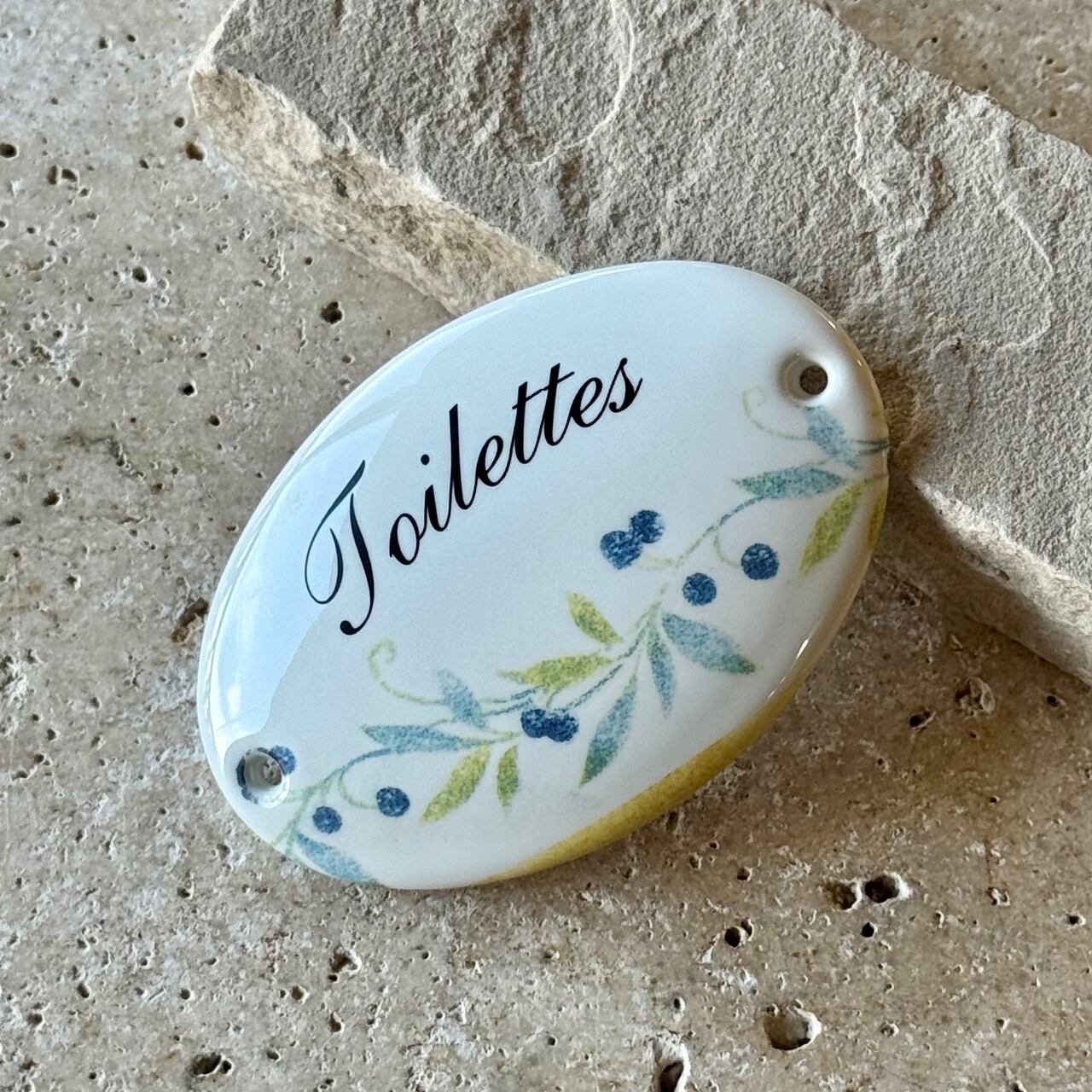 リモージュ焼の技術を生かしたこのプレートは、オリーブ柄やブルーとイエローの配色が何ともプロバンスらしい素敵なデザインです。南フランス・プロバンスのエスプリが効いた愛らしく上質なサインプレートです。