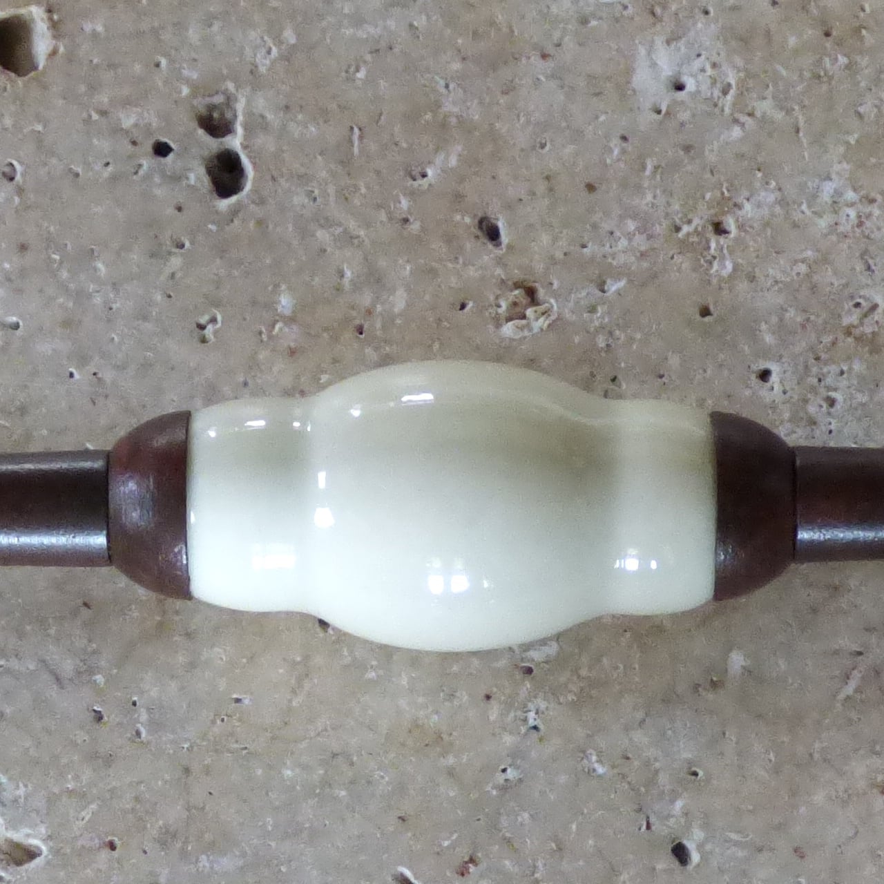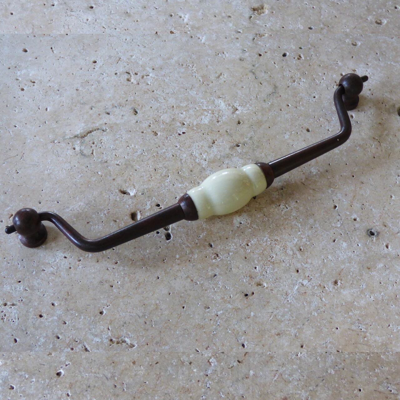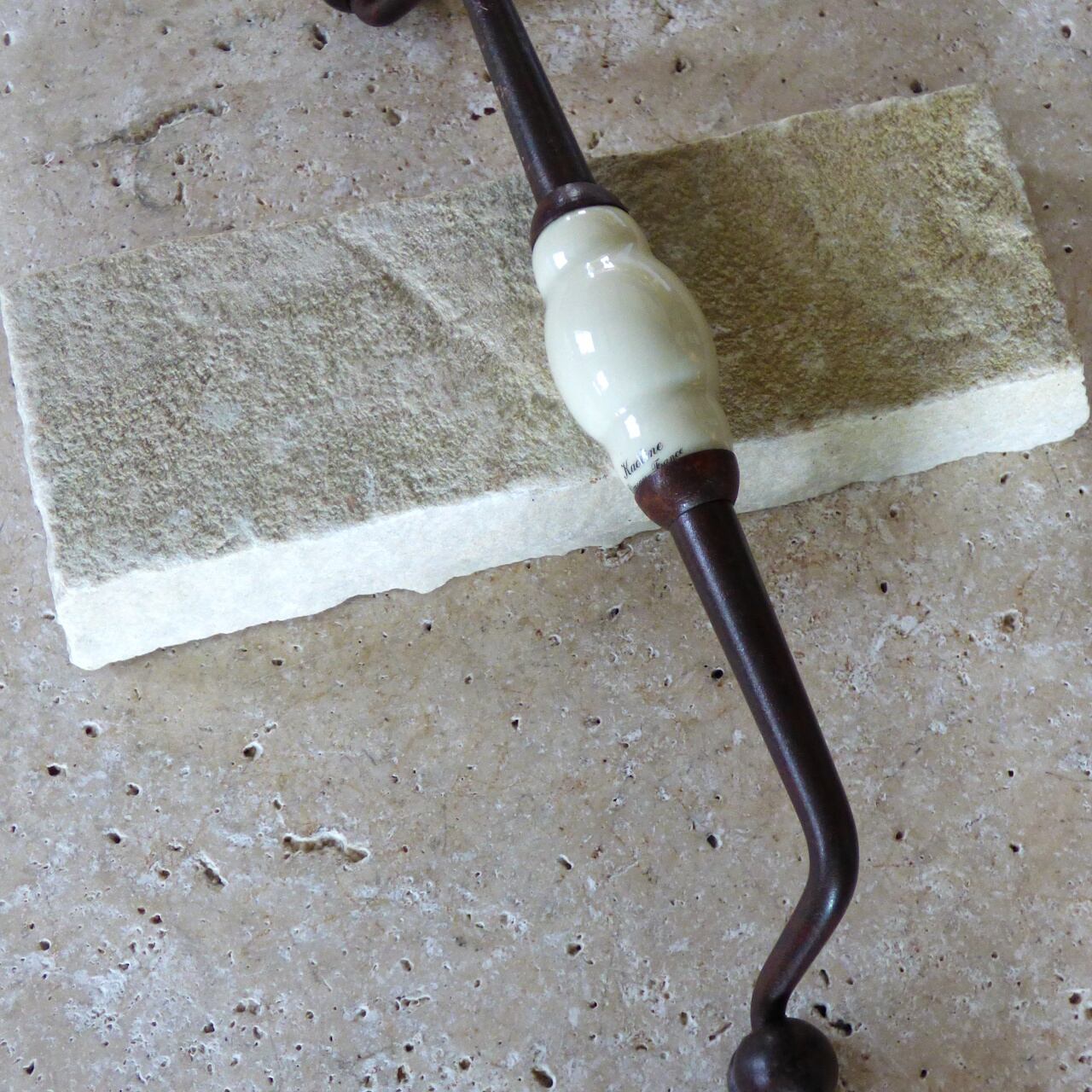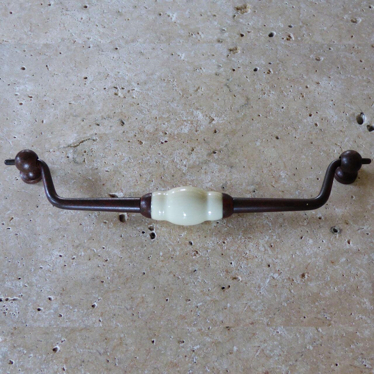 リモージュ焼の技術を生かしたこの取手は、柔らかなアイボリー色が特徴的で、赤錆ワックス仕上げの鉄部分がアンティーク感を演出します。
