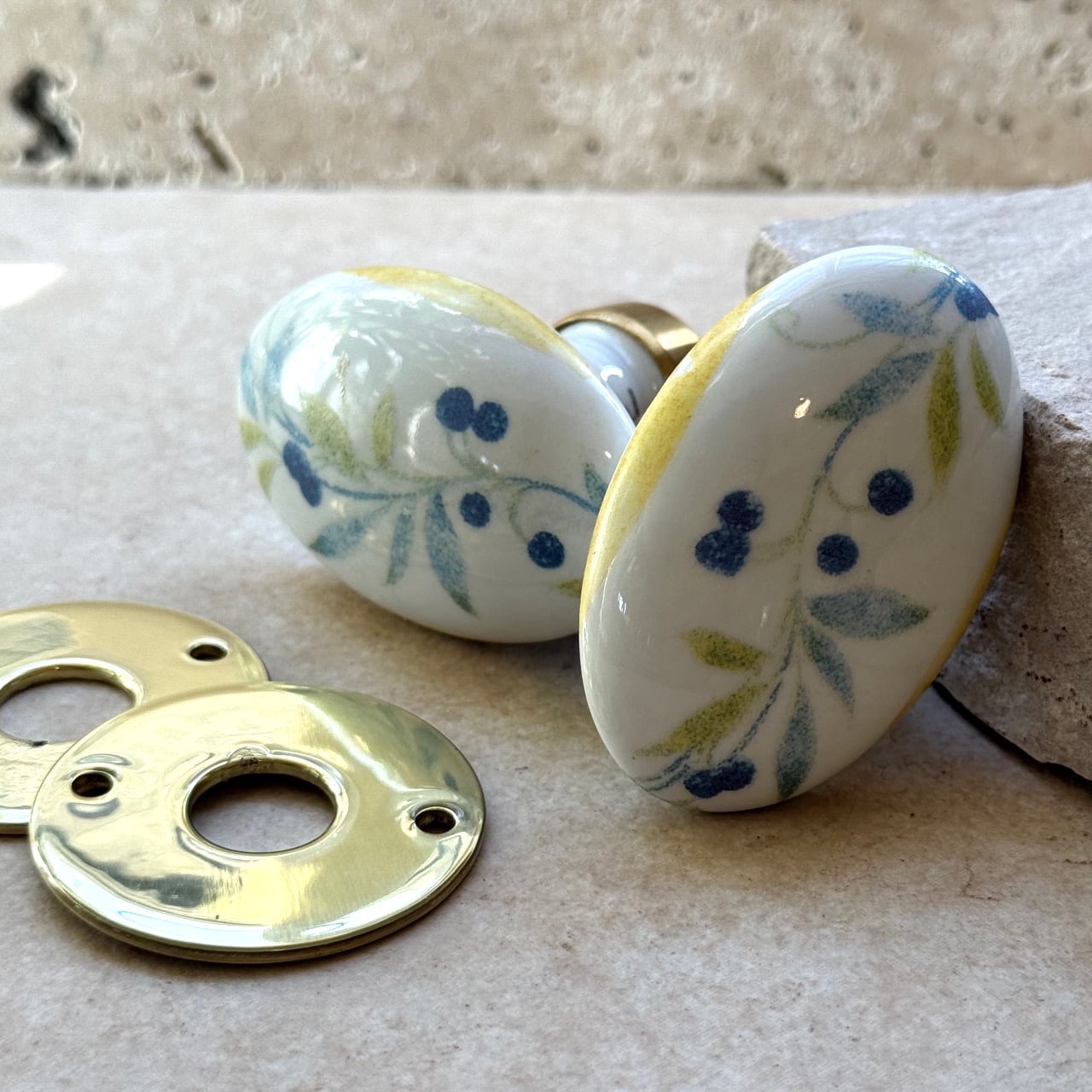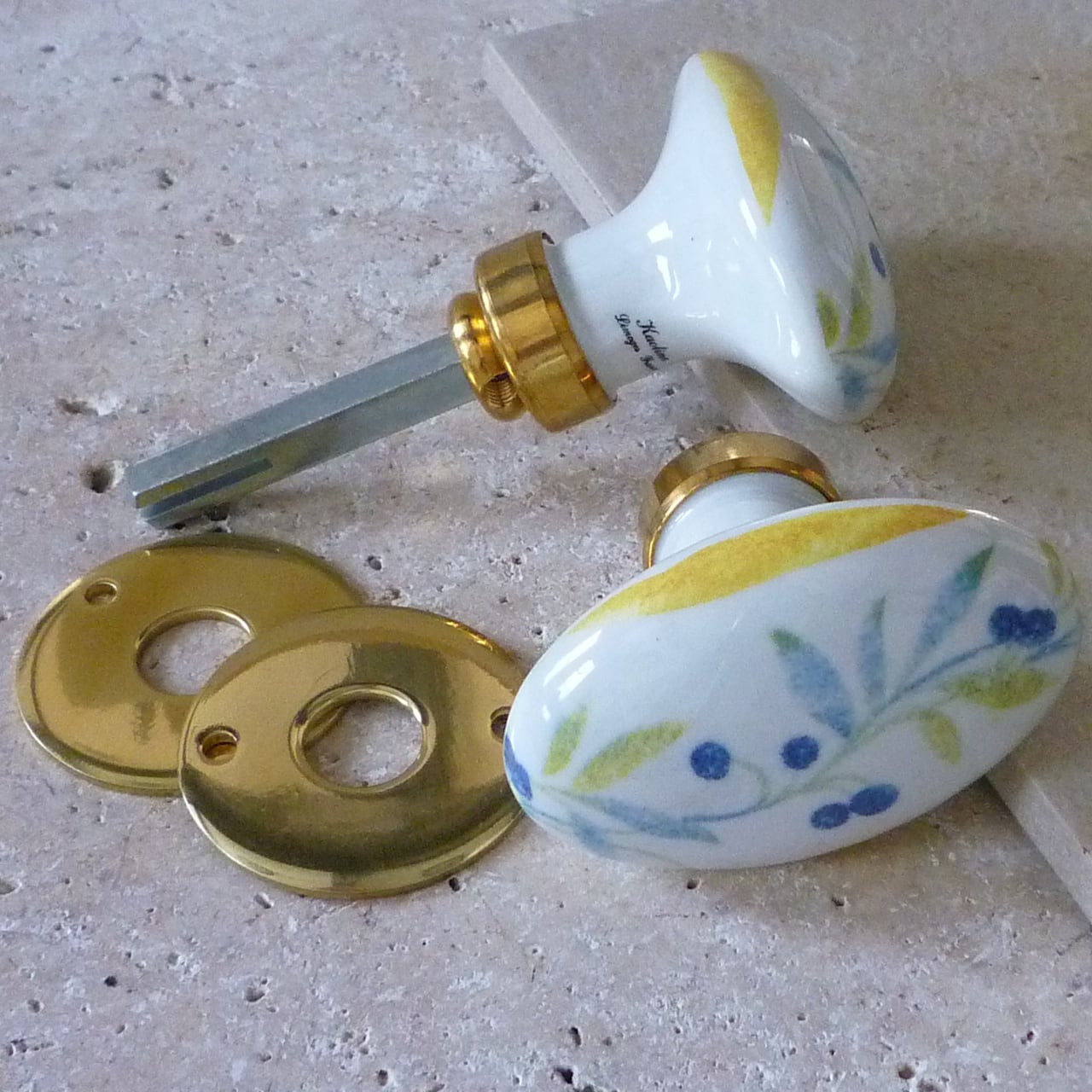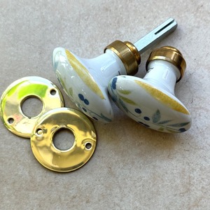 このドアノブは、フランス製で、オリーブが描かれたプロバンス柄が魅力です。オーバルデザインと陶器色の温かみが感じられ、金属部分は真鍮光沢ニスなし仕上げとなっており、シンプルながらも洗練された印象を与えます。手になじむフォルムと心地よい触感が、毎日の生活を豊かに彩ります。