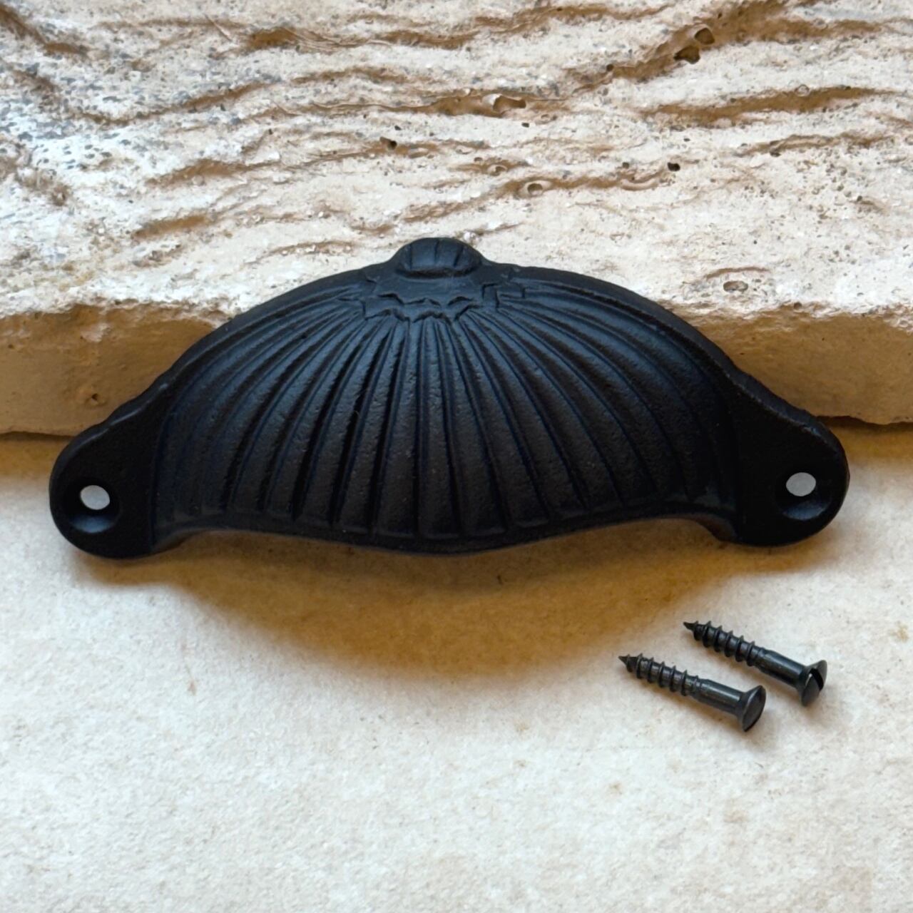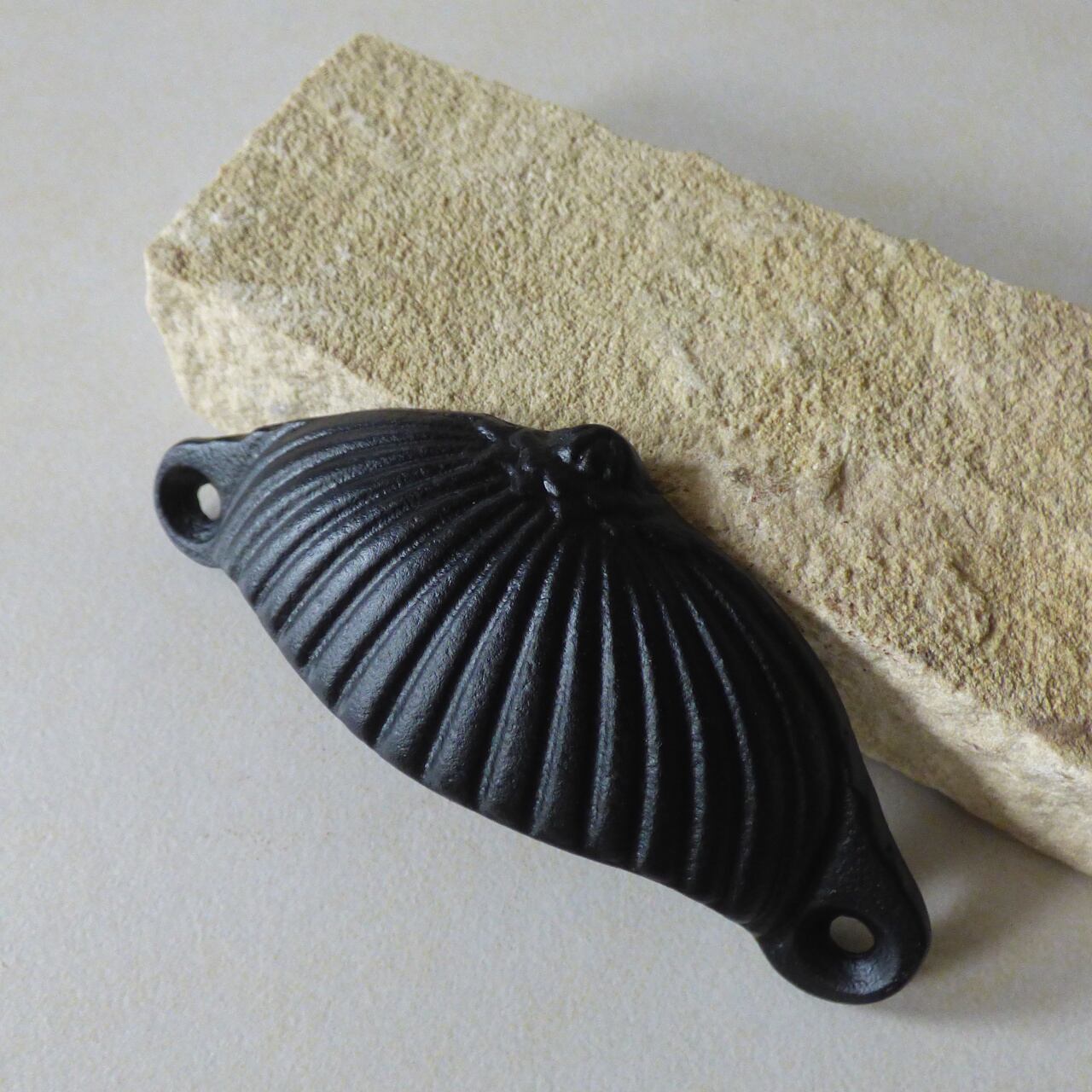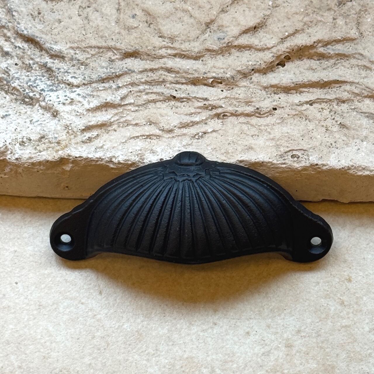 この取手は、フランス製で、シェル型の丸みを帯びた優雅なデザインが魅力です。手に当たる部分はゆるやかなカーブを描いており、使い勝手の良い形状になっています。金属部分は「鉄・くろ鉄仕上げ」で、上品かつ落ち着いた印象を与えます。モダンなインテリアからクラシックなスタイルまで、さまざまなデザインにフィットします。