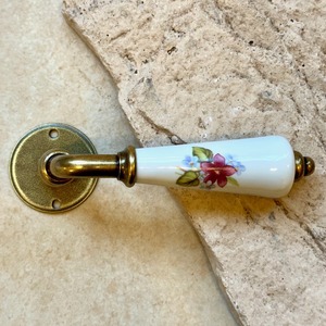 このセットは、可憐なすみれ柄が描かれた、美しいデザインのレバーハンドルがフランスの伝統を感じさせ、金属部分は「真鍮古味仕上げ」で、優雅さとともに高級感を演出します。