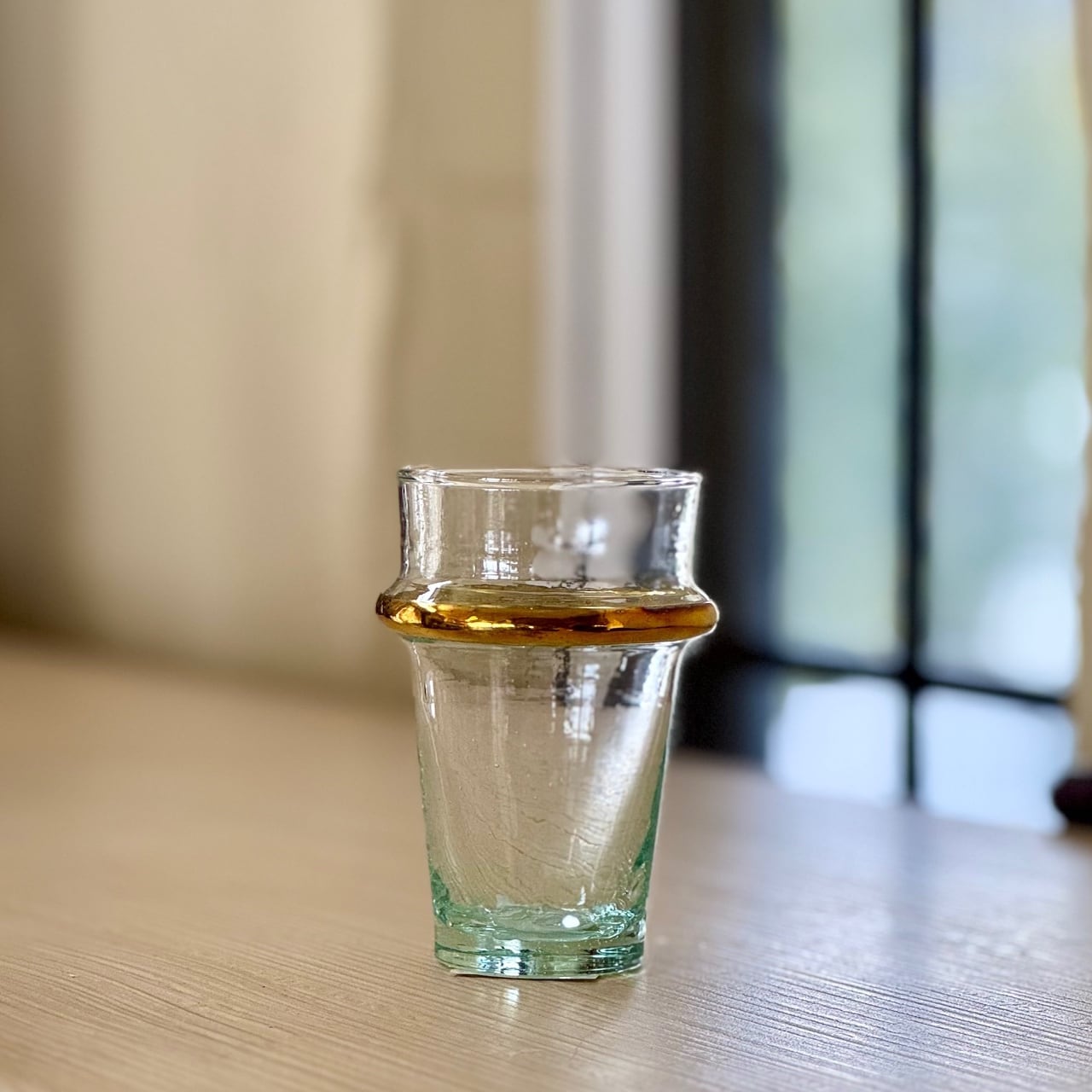 モロッコグラスゴールドラインSは、モロッコで伝統的に使用されてきたリサイクルガラスを使用した魅力的なグラスです。吹きガラスによる独特な気泡の入り方が、美しさと温かみを与え、ハンドメイドならではの特別な味わいをお楽しみいただけます。日常の飲み物を注ぐだけでなく、フラワーベースとしてもおしゃれに演出してくれるアイテムです。